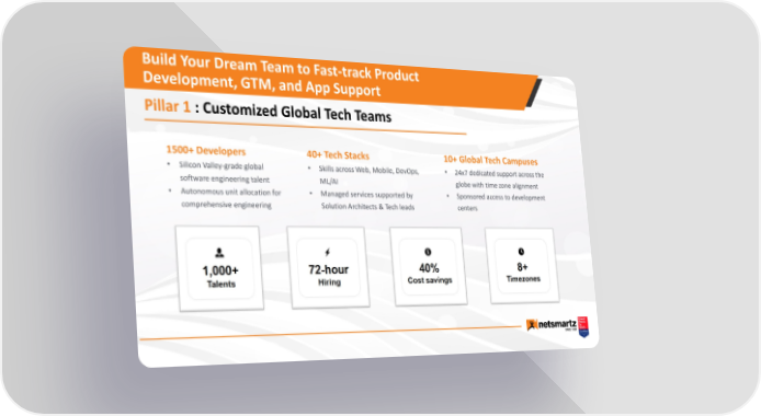Build Your Dream Team to Fast-track Product Development, GTM, and App Support Pillar 1 : Customized Global Tech Teams 1500+ Developers 40+ Tech Stacks 10+ Global Tech Campuses • Silicon Valley-grade global • Skills across Web, Mobile, DevOps, • 24x7 dedicated support across the software engineering talent ML/AI globe with time zone alignment • Autonomous unit allocation for • Managed services supported by • Sponsored access to development comprehensive engineering Solution Architects & Tech leads centers
