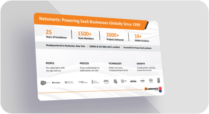 Netsmartz: Powering SaaS Businesses Globally Since 1999 25 1500+ 2000+ 10+ Years of Excellence Team Members Projects Delivered Global Locations Headquartered in Rochester, New York | CMMi3 & ISO 9001:2015 certified | Successful in-house SaaS products PEOPLE PROCESS TECHNOLOGY GROWTH Pre-vetted talent with Proven methodologies to Modern tech stack, Lead generation, marketing, the right skill sets build, launch, and scale including DevOps & GenAI & back-office services