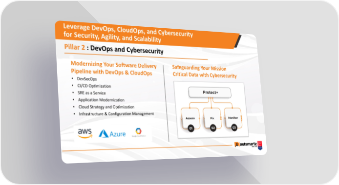 Leverage DevOps, CloudOps, and Cybersecurity for Security, Agility, and Scalability Pillar 2 : DevOps and Cybersecurity Modernizing Your Software Delivery Safeguarding Your Mission Pipeline with DevOps & CloudOps Critical Data with Cybersecurity • DevSecOps • CI/CD Optimization • SRE as a Service • Application Modernization • Cloud Strategy and Optimization • Infrastructure & Configuration Management