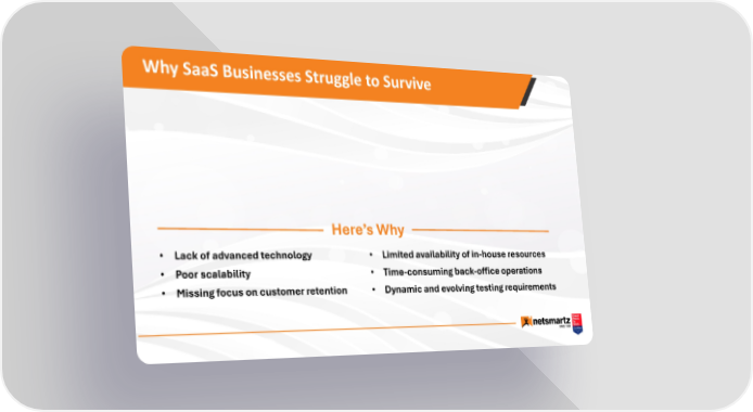 Why SaaS Businesses Struggle to Survive Here’s Why • Lack of advanced technology • Limited availability of in-house resources • Poor scalability • Time-consuming back-office operations • Missing focus on customer retention • Dynamic and evolving testing requirements
